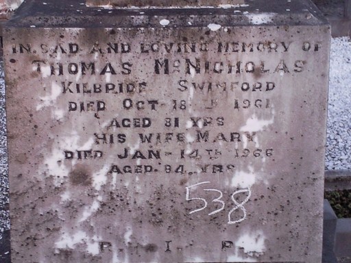 Thomas McNicholas from Kilbride died October 1961 aged 81